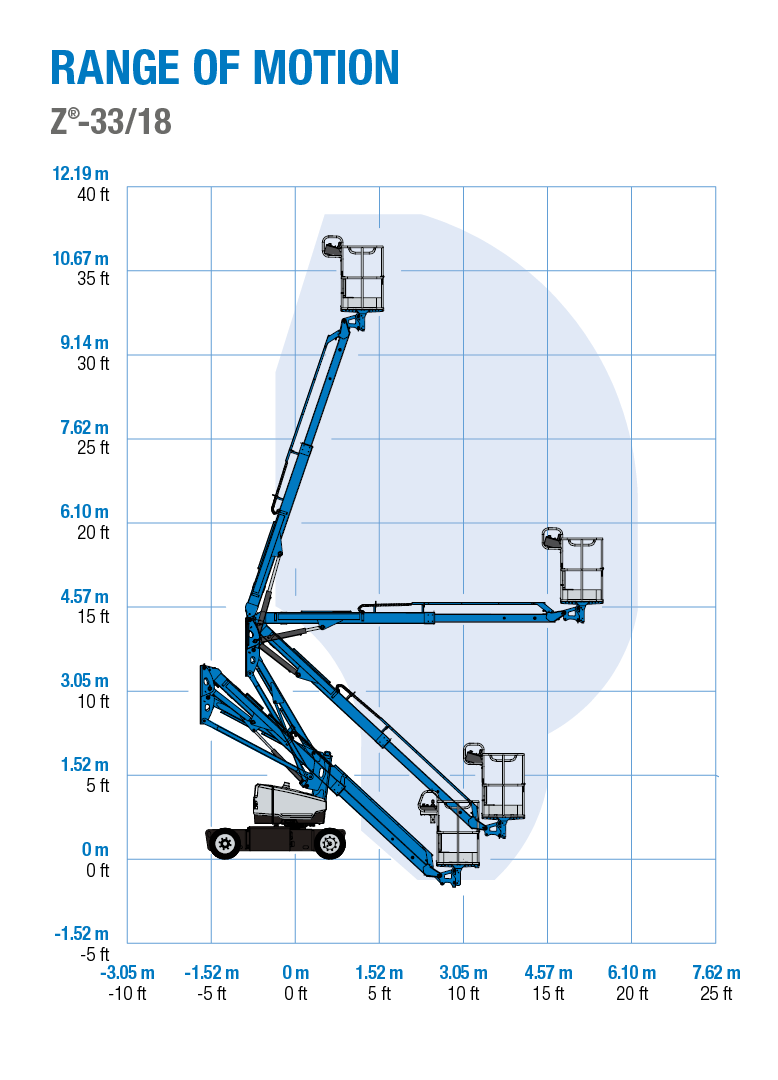 Verhoog de productiviteit met de Genie Z-33/18 kniktelescoophoogwerker. Deze hoogwerker heeft een maximale werkhoogte van 12 meter en een reikwijdte tot ruim 5,5 meter. Met de Genie Z-33 heeft u de mogelijkheid om werkzaamheden uit te voeren op de meest moeilijke en toegankelijke werkgebieden. Het werkplatform heeft een maximale capaciteit tot 200 kg. Door een lage geluidshinder is de machine uiterst geschikt voor binnen werkzaamheden en/of rondom scholen en ziekenhuizen.